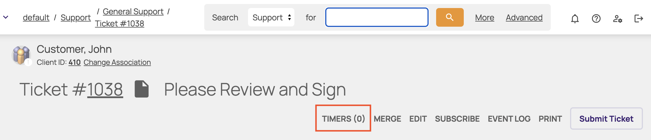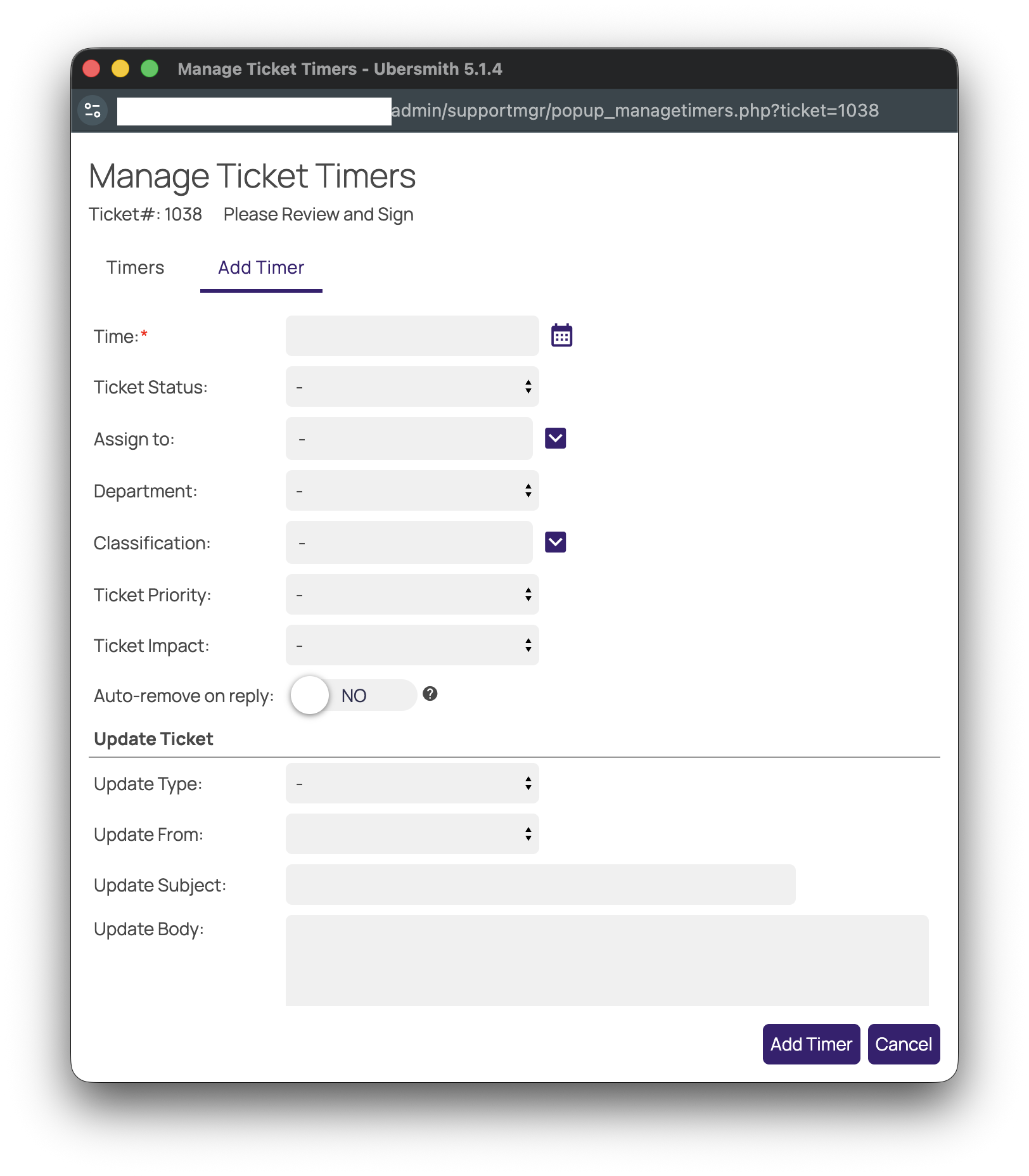 Using Ticket Timers Estimated Reading Time: 1 Minutes Ticket timers automate actions on Support Manager tickets.With a timer you can: Change ticket status, priority, department or owner Schedule an automated follow‑up post (staff, public or private) Send a notification email to an admin user The timer runs at the date and time you set, unless it is removed by a reply (see Auto‑remove on reply). How to Create a Ticket Timer Open the ticket you want to schedule an action for. Click the “Ticket Timers” link in the upper‑right corner. In the popup, switch to the “Add Timer” tab. Date & Time – Pick when the timer should fire. Ticket Settings – Choose which fields (status, priority, etc.) to change. Auto‑remove on reply – If set to Yes, the timer is canceled when a client replies; if No, it runs regardless of ticket changes. Update Ticket (optional) Create a staff follow‑up, public or private comment. Set From, Subject and Body. Staff follow‑ups are emailed to the ticket author; comments are not. Send Notification (optional) Select or edit an admin recipient. Set Subject and Body. Notifications are not added to the ticket’s post history. When you’re finished, click “Add Timer” at the bottom to schedule the event. How to Delete a Ticket Timer Go to the “Timers” tab of the ticket. Tick the checkbox next to the timer you want to remove. Click “Delete Selected” at the bottom of the page. Deleting a timer cancels all actions that were scheduled for it.