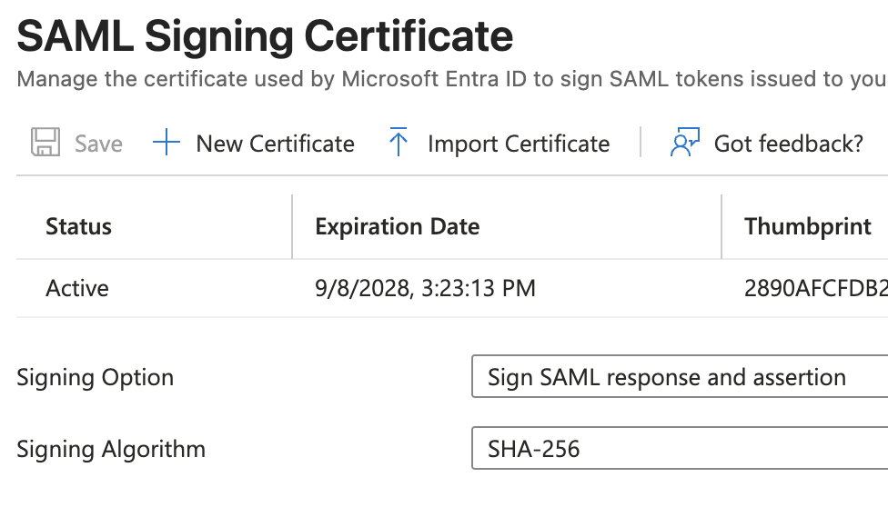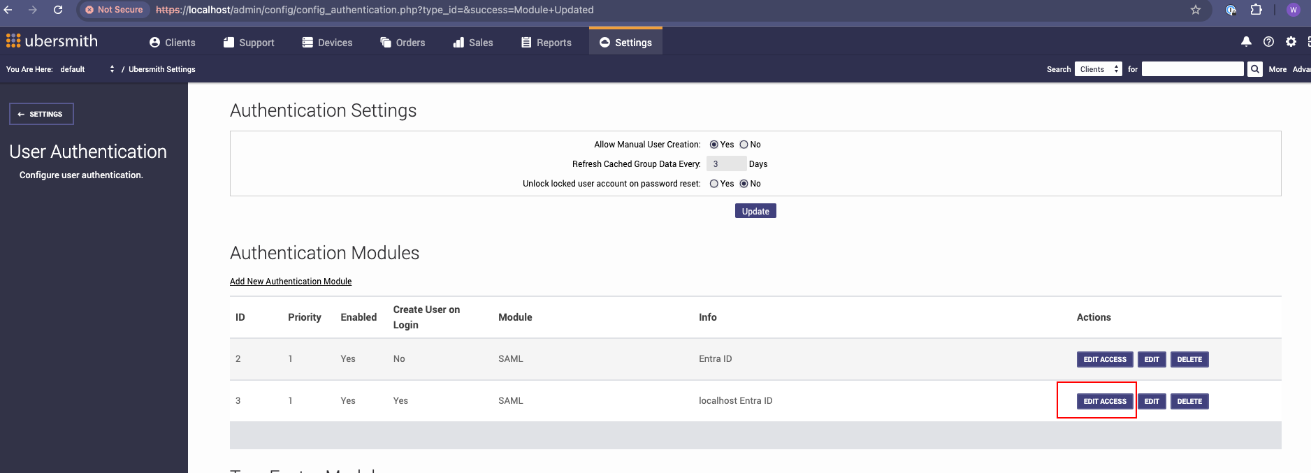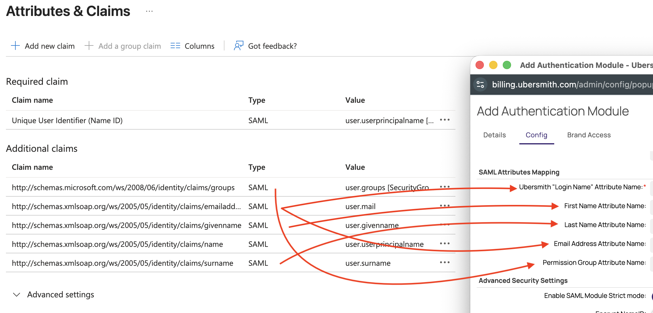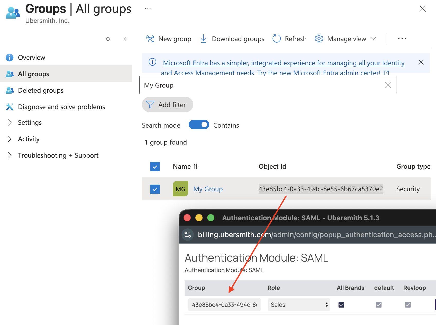Configuring Microsoft Entra ID SAML Estimated Reading Time: 2 Minutes Before configuring Ubersmith's SAML authentication module to use Microsoft Entra ID, you will to be able to access your instance with https. This is required because the identity provider (IdP, in this case, Microsoft) will require the login URL to use HTTPS. Microsoft Entra ID (Formerly Microsoft Azure AD) Configuration This documentation assumes the following prerequisites have been met: A Microsoft Azure account with appropriate privileges to create SAML Applications An Ubersmith administrator account with appropriate privileges to edit User Authentication settings Create "Enterprise Application" On the left menu, click Entra ID Click Enterprise Application Click + New application Select + Create your own application Name your application (ex. "Ubersmith") and make sure to select the Non-gallery option Configure the Basic SAML Configuration information Configure the Attributes & ClaimsThe default configuration provided by Microsoft already offers all fields that Ubersmith requires -- except a group claim, which must be added. For the group claim, use Security groups. Configure Users and groupsIn order for your Entra ID users to login, you must give users (or groups) access to the application. Bear in mind that you will be able to associate the groups defined in Entra ID to Roles within Ubersmith. Enable SigningTo take advantage of encryption, additional settings must be enabled for your Entra ID SAML application. Configure Ubersmith In Settings, click User Authentication. Click Add New Authentication Module. Enabled: Yes Module: SAML Priority: 1 (or appropriate) Create User on Login: Checked Check the Create User on Login so newly added Microsoft Entra ID users will be created in Ubesmith when they first log in to Ubersmith. Use the Attributes & Claims values from your Entra ID configuration to populate the fields within the Authentication Module popup. Ensure the Entity ID configured in your Entra ID application matches the Service Provider (SP) Entity ID configured in Ubersmith. This will be the HTTPS URL for your Ubersmith installation; for example, https://myubersmith.yourdomain.com. If needed, use the command from the popup's tooltip to generate your SP x509 Certificate and private key. To take advantage of encryption, additional settings must be enabled for your Entra ID SAML application and within Ubersmith. Click Edit in the SAML Certificates menu and enable the Sign SAML response and Assertion option. Download the Certificate (Base64) file from your Entra ID Application, and paste it into the IdP x509 Certificate field in the Ubersmith configuration. Note: If Strict Mode is True, then the SAML integration will reject unsigned or unencrypted messages if it expects them to be signed or encrypted. Also, it will reject the messages if the SAML standard is not strictly followed. Destination, NameId, and Conditions are validated too. Save the Authentication Module. You can now, map Ubersmith's roles to Microsoft Entra groups: Unfortunately, at this time, Entra ID Object Ids must be used for the role mapping, rather than the Group Names.